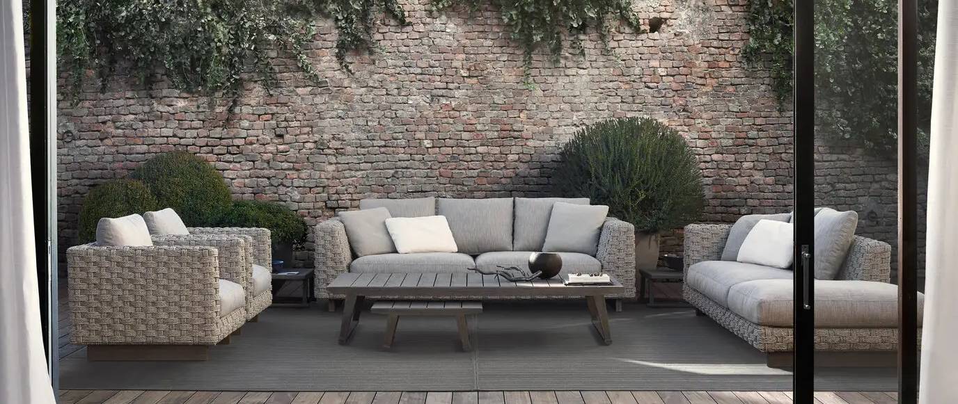 Для уличных диванов B&B Italia используются алюминий, дерево, а также декоративное плетение из полиэтилена. Такие материалы устойчивы к солнцу и влаге, легко переносят смену сезонов и сохраняют аккуратный внешний вид. Мягкие подушки имеют съемные чехлы и подходят для регулярного использования на улице.