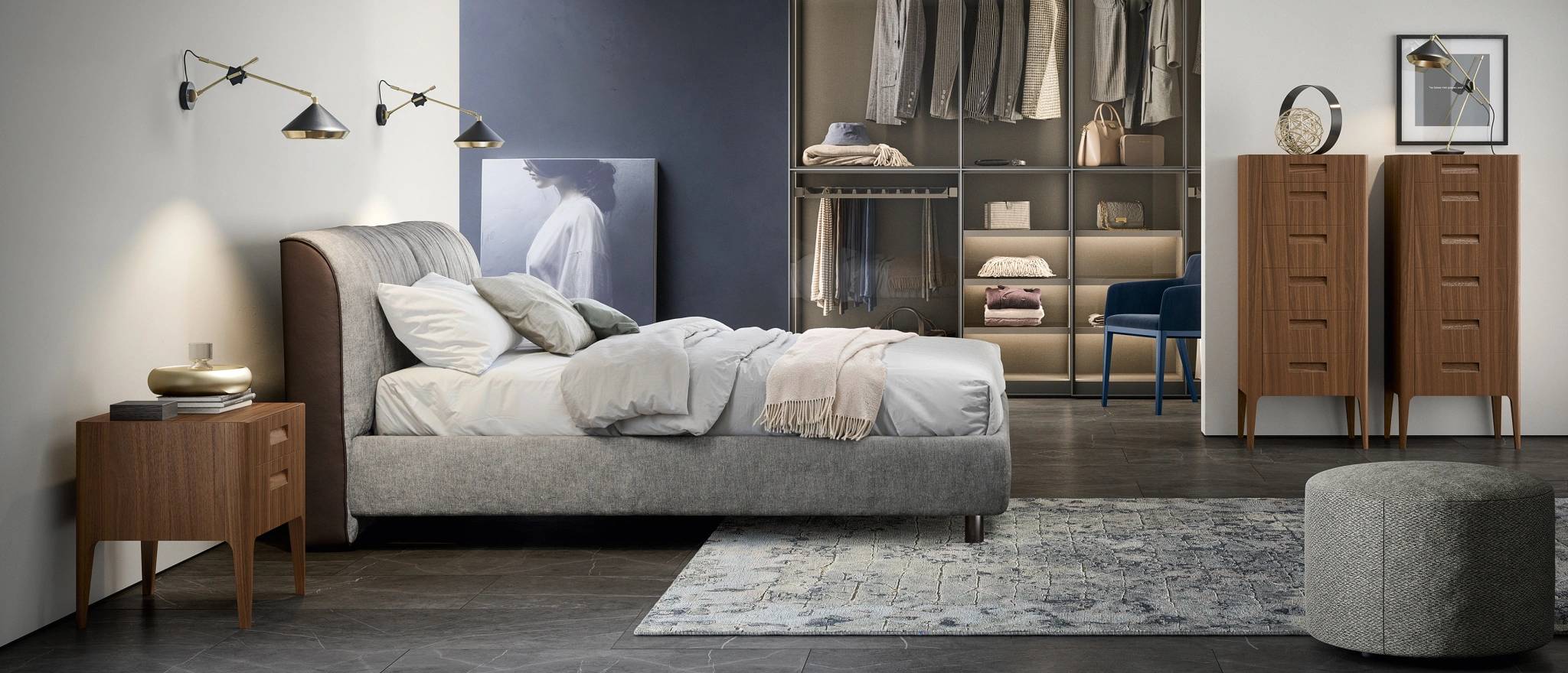 Модель Belleville предлагает более мягкое, обволакивающее изголовье и гармоничное сочетание обивки с тонкими деталями корпуса. Текстильные поверхности создают уютную атмосферу, а спокойные оттенки подчёркивают расслабленный характер спальни.