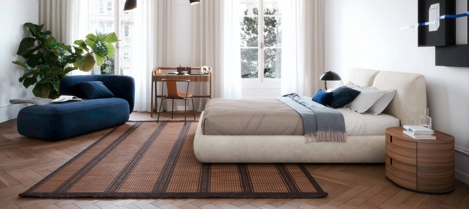 Novamobili уделяет внимание материалам и деталям: аккуратная строчка, мягкая обивка, деревянные основания и выразительные силуэты создают комфорт, который чувствуется каждый день. Кровати выглядят визуально лёгкими, несмотря на объём изголовья, благодаря сбалансированным линиям и тщательно продуманным пропорциям.
