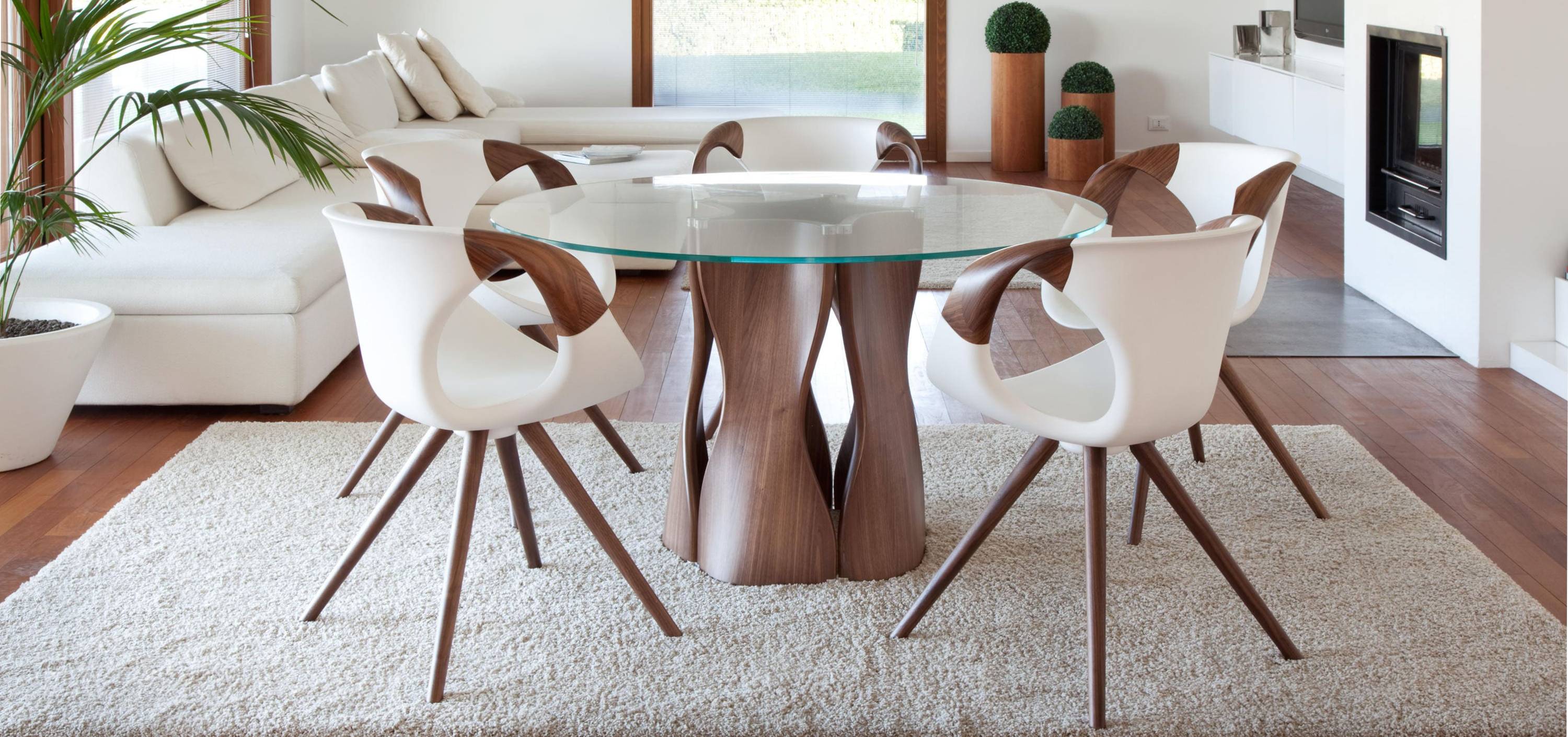 Один из самых выразительных примеров — Alpha 300, разработанный Fabio di Bartolomei. Керамическая столешница и дубовое основание, состоящее из двух изогнутых элементов с пазами, создают игру объёмов и пустот. Конструкция одновременно передаёт ощущение устойчивости и отсылает к ремесленным традициям ручной обработки дерева. Стол ориентирован на просторные жилые пространства и деловые залы, где требуется предмет, сочетающий эстетику и функциональность.