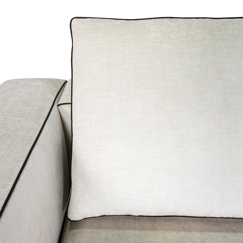 Модель обита тканью WI524 Wallaby — мягкой, плотной и выразительной по фактуре. Её текстура подчёркивает объём и добавляет ощущение тепла. Визуальный акцент задаёт кант Gros Grain цвета Dark Brown, точно очерчивающий форму и добавляющий глубины.