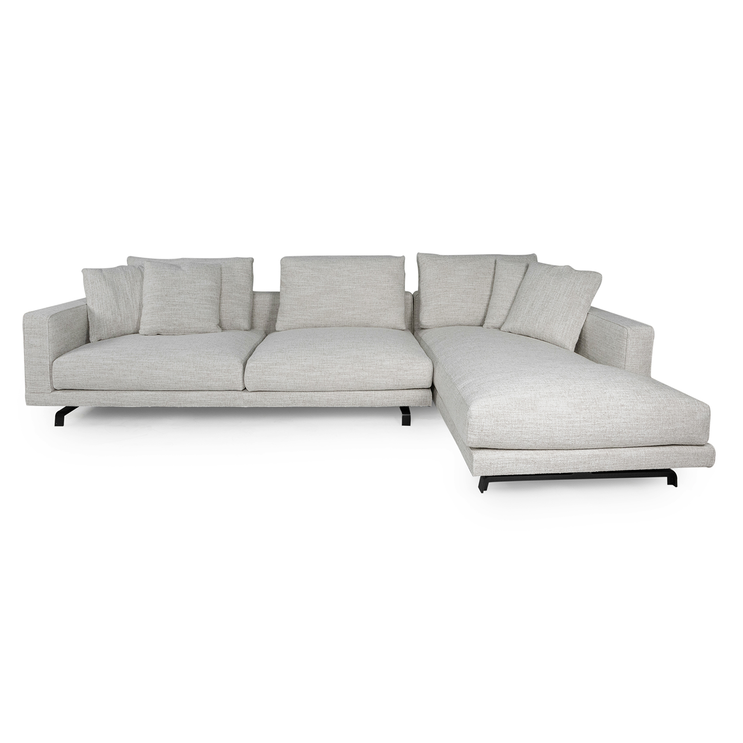 Этот диван идеально подойдёт для просторной гостиной в стиле модерн, минимализм или скандинавский интерьер. Угловая конфигурация с открытым шезлонгом позволяет эффективно использовать пространство и организовать зону отдыха. Светлый оттенок обивки делает его подходящим как для монохромных интерьеров, так и для сочетания с яркими акцентами в декоре.