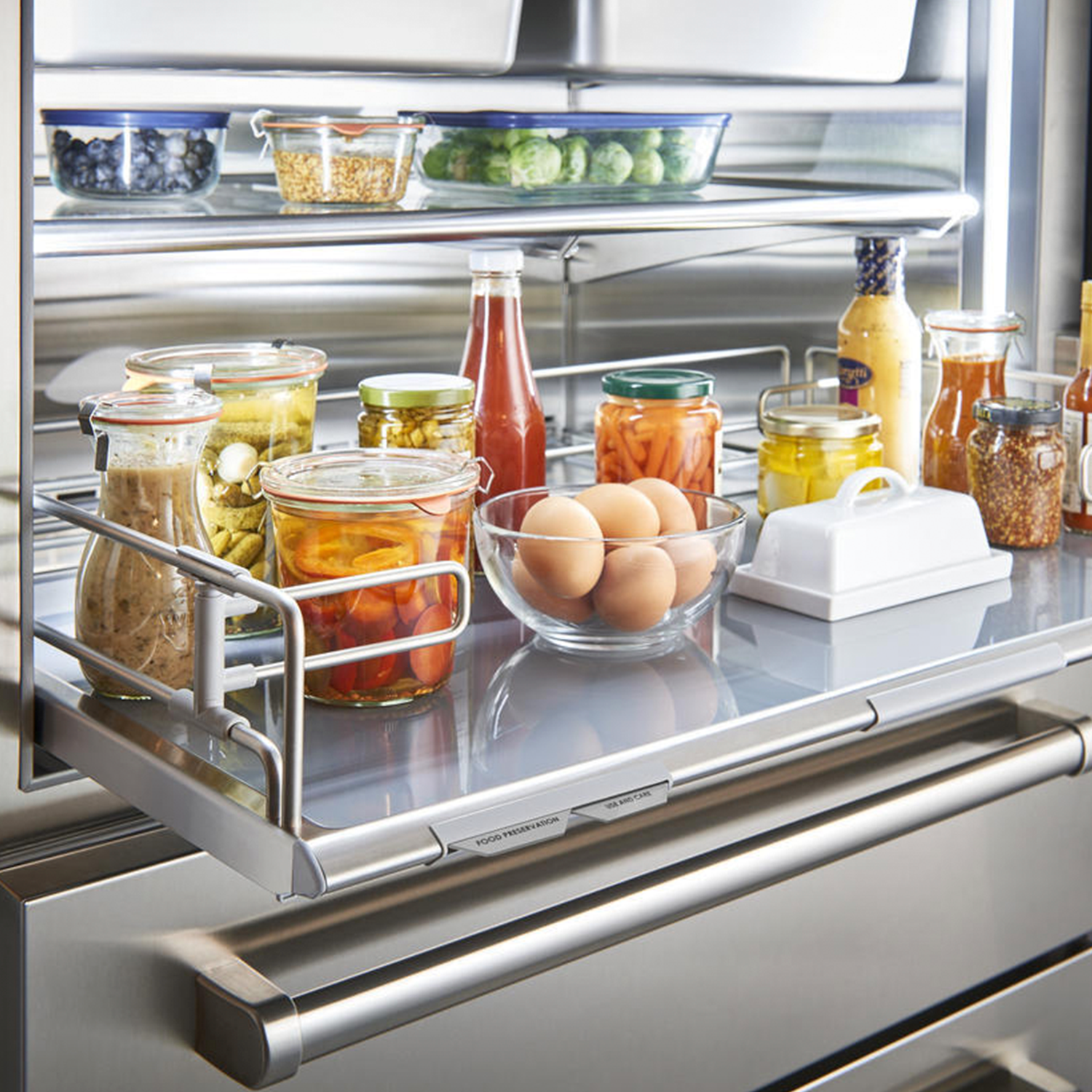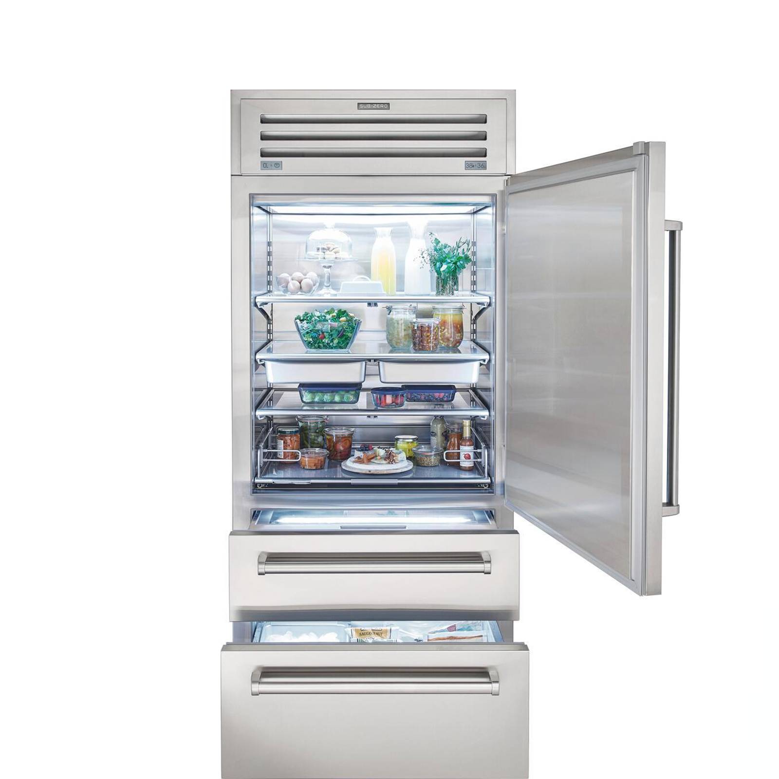 Холодильник Sub-Zero, полностью стальной, с двойной системой охлаждения, с антибактериальной системой очистки воздуха, с тремя температурными зонами (включая зону повышенной влажности для деликатесов), с адаптивной системой размораживания, с ледогенератором, с глухой дверкай. Полезный объём холодильной камеры - 564л, полезный объём морозильной зоны - 136л, петли слева.