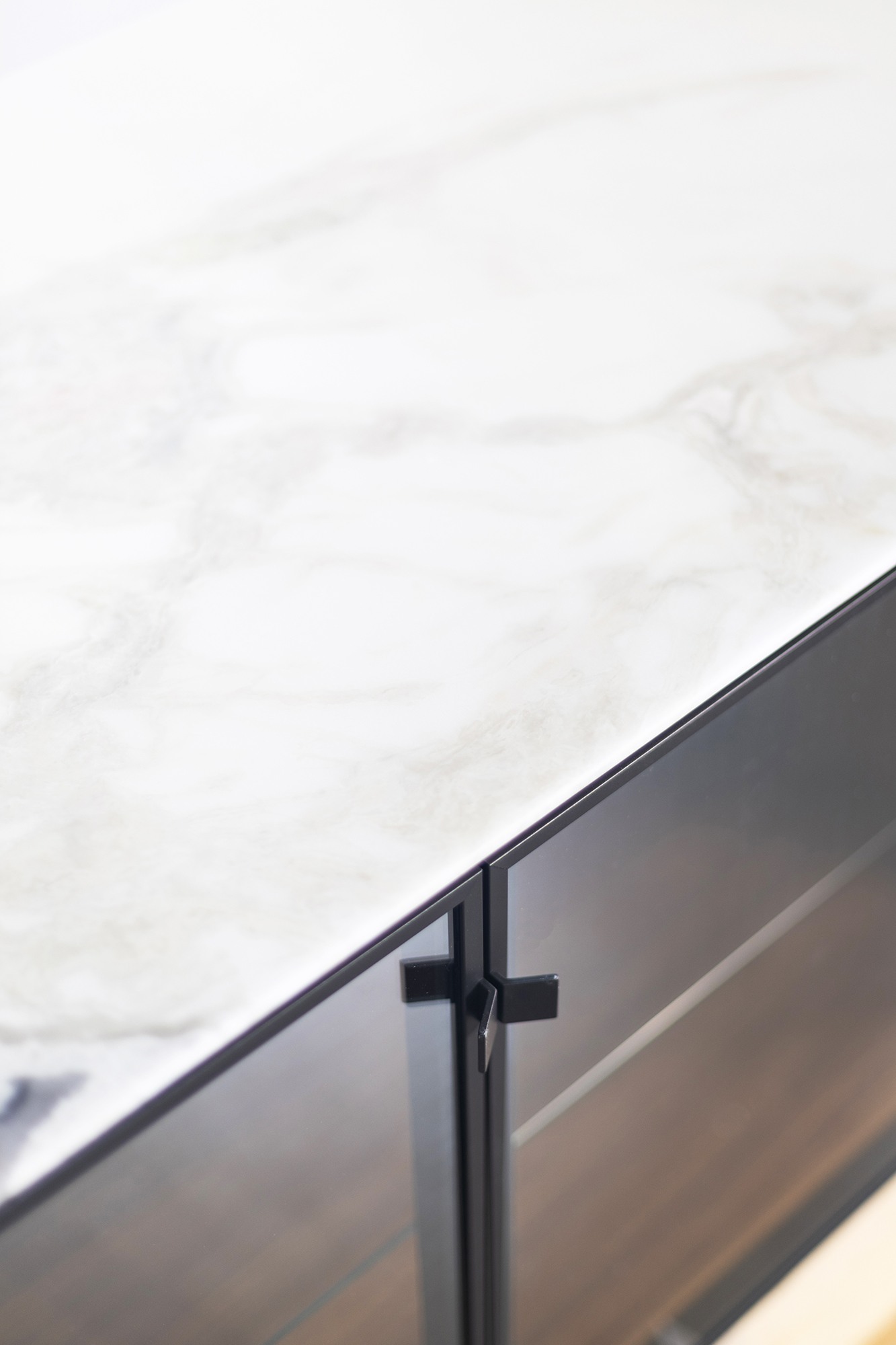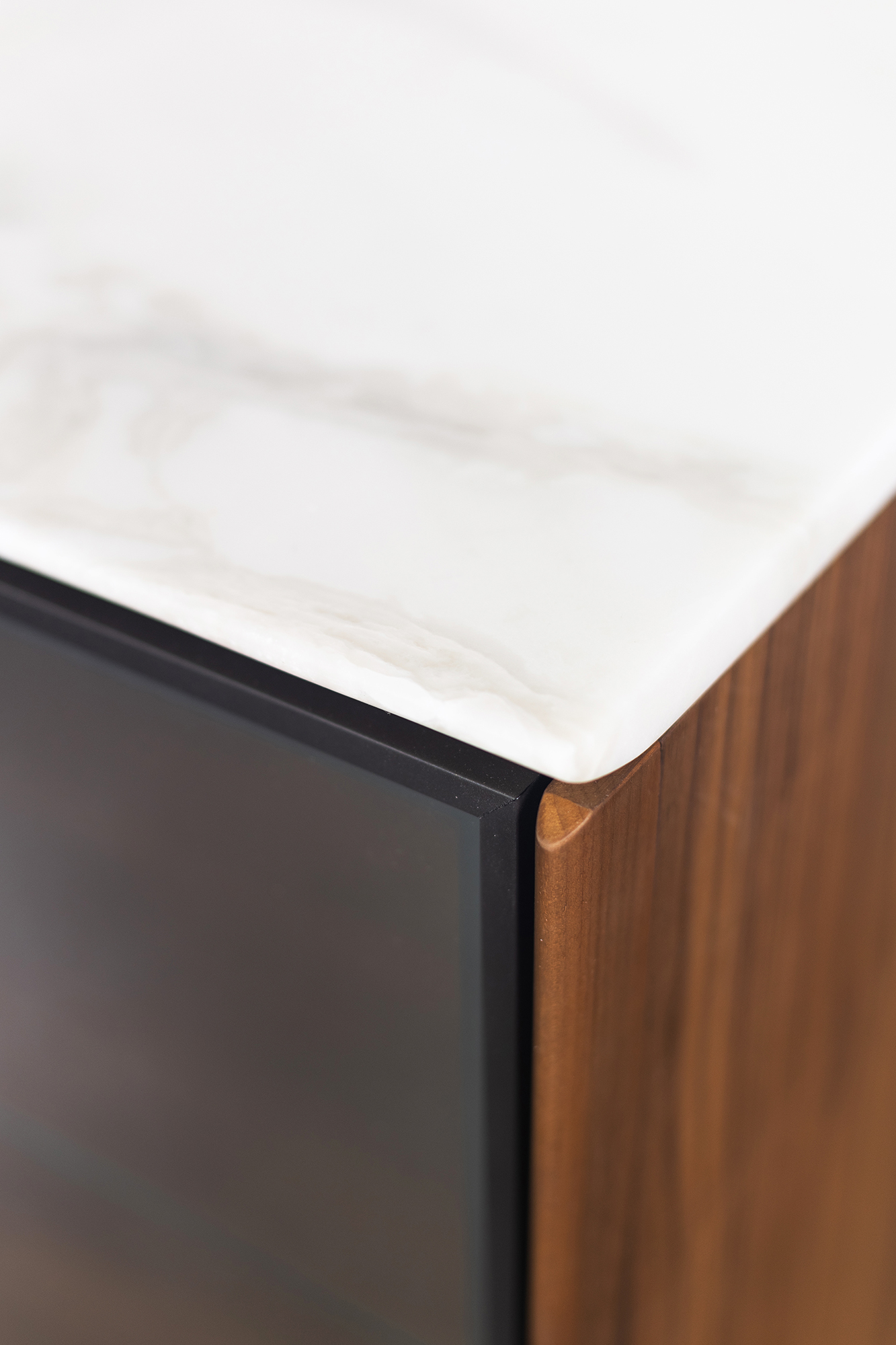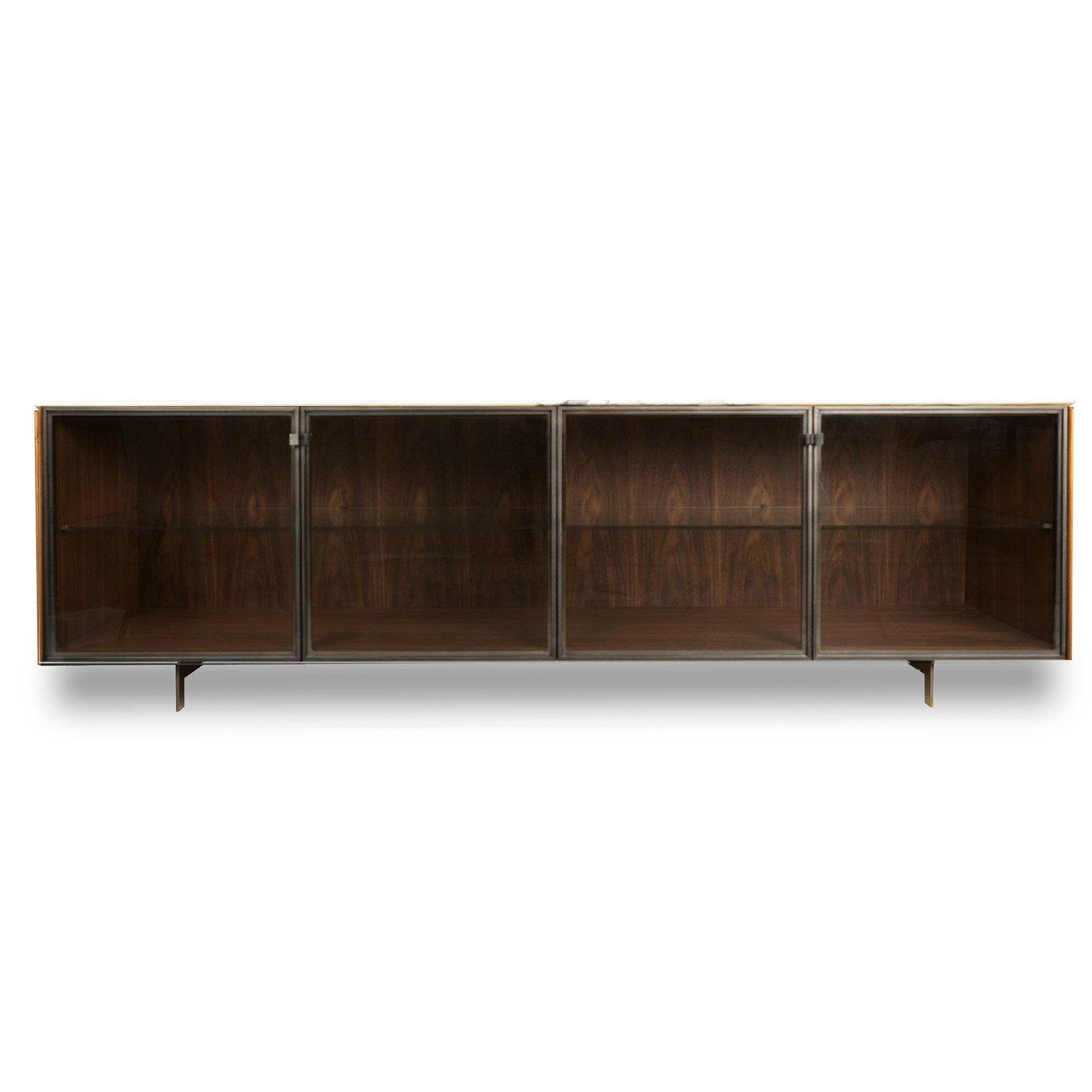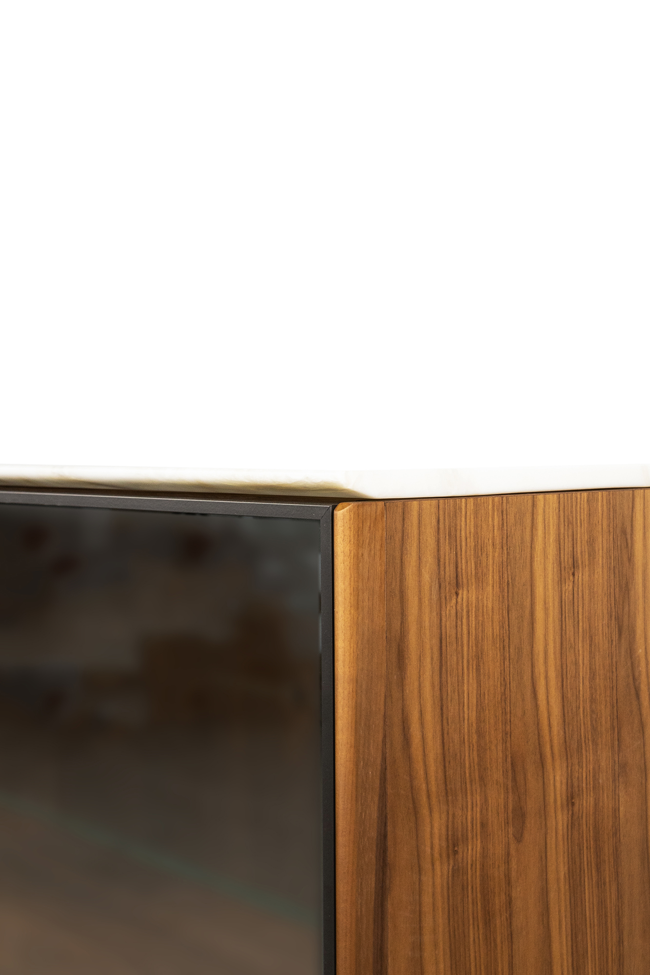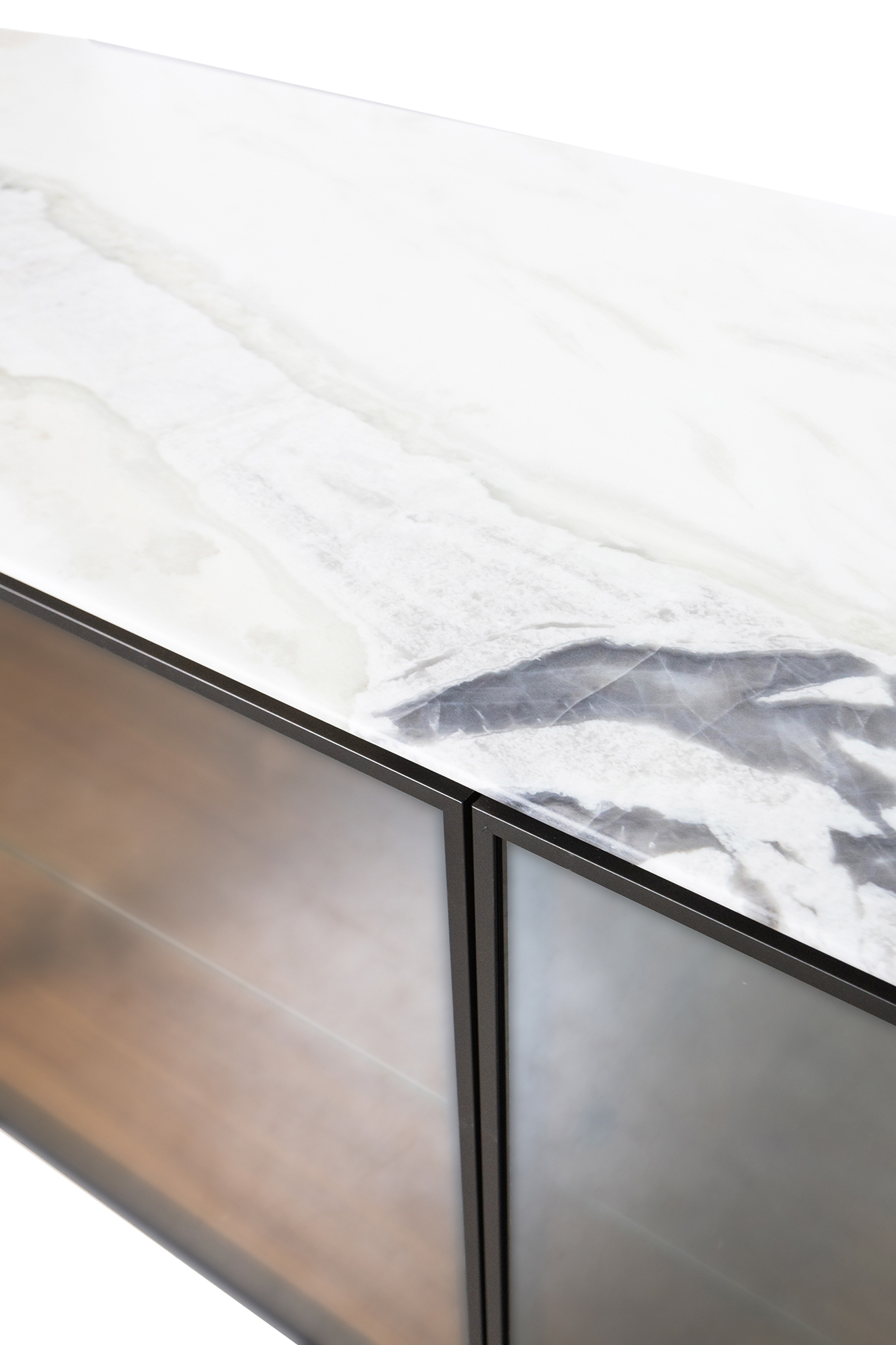 корпус и задняя стенка-дерево Canaletta Walnut, столешница-мрамор Dover White, дверцы-стекло Stopsol Supersilver Light, ножки и профиль-металл Grey Pewter