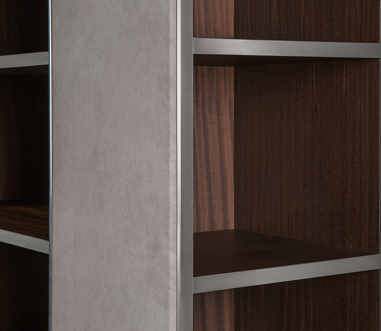 с 6 ПОЛКАМИ с отделкой дерево зебрано или орех Canaletto. Передняя и задняя панели обтянуты кожей P.3 Кат. Suede.