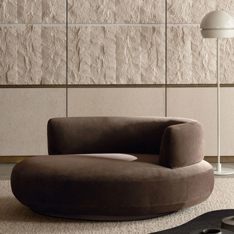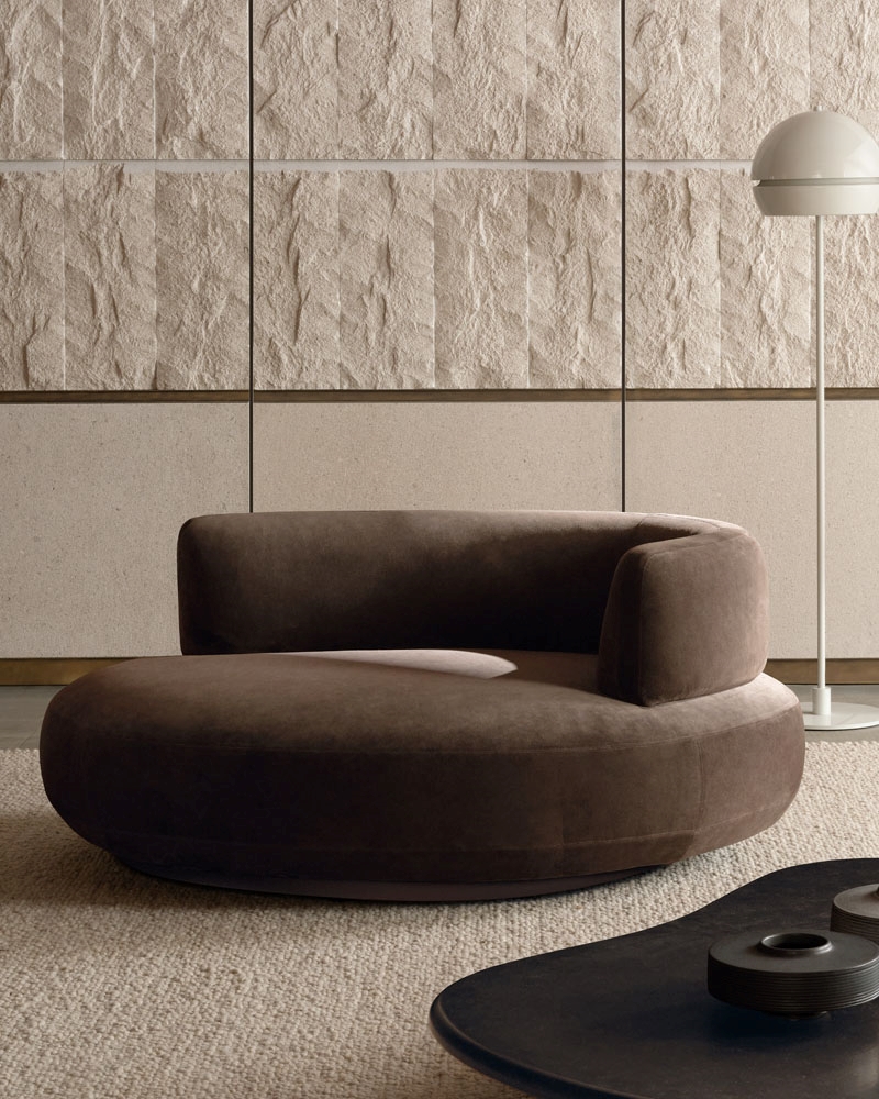 Сложное переплетение нитей обивки дарит цвету глубину и визуальную бархатистость. Ткань плотно облегает пышные формы и выгодно выделяет их скульптурный силуэт на фоне прямых линий интерьера. Просторное ложе с дополнительной подушкой обеспечивает комфорт уровня премиального спа-курорта.