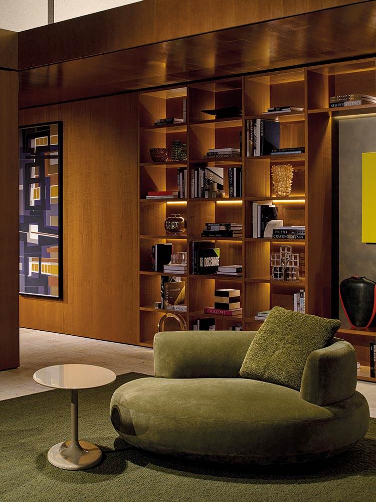 Кресло великолепно солирует в больших залах и совершенно не терпит тесноты. Оно станет идеальным компаньоном для современного искусства или авторского ковра ручной работы. Благородный тон создает красивый контраст с теплыми деревянными панелями и патинированной бронзой.