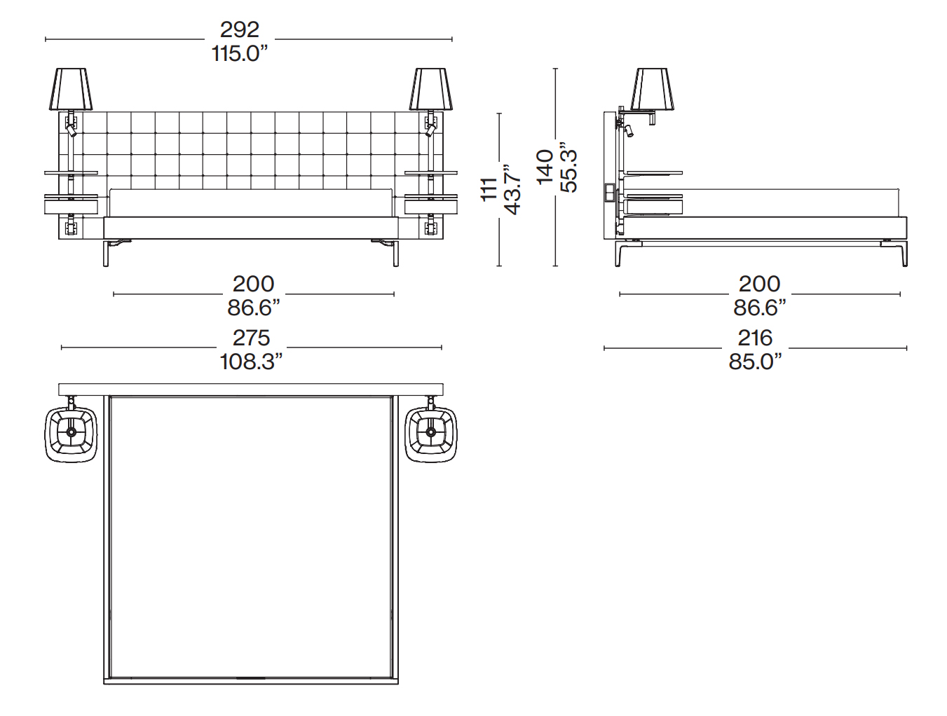 Модель дополнена аксессуарной планкой с USB-розеткой, прикроватными полками-столиками и двумя абажурами. Такое решение объединяет функциональность и изысканность, превращая спальню в пространство для отдыха и уединения. Каждая деталь продумана для максимального удобства и эстетического удовольствия.