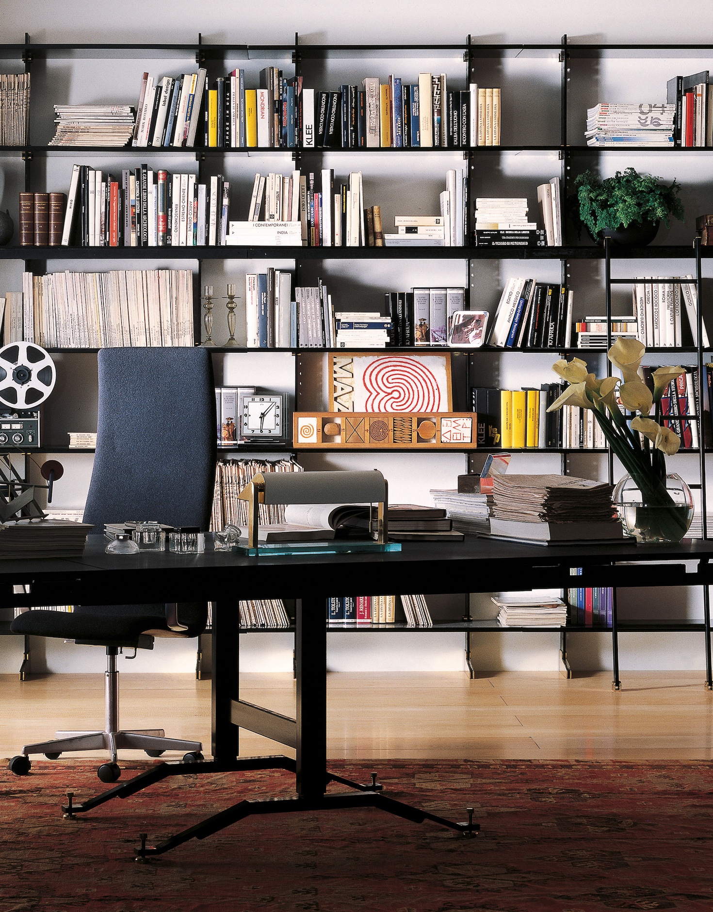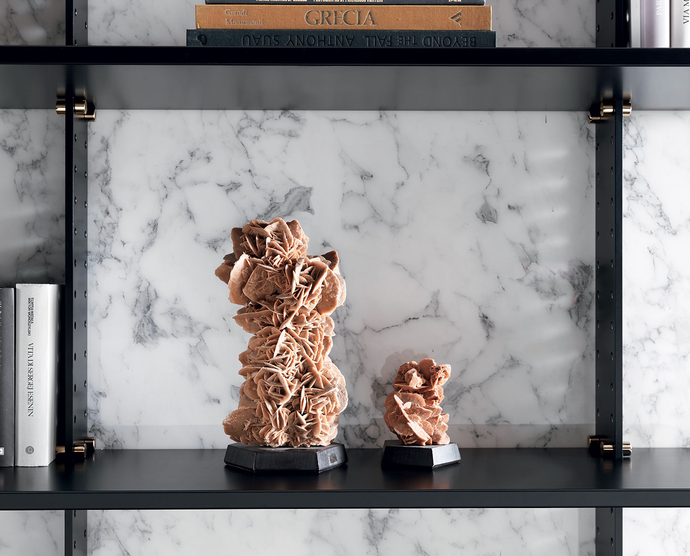 Elegie гармонично смотрится в просторных гостиных, кабинетах или домашних библиотеках, где важны высота, масштаб и геометрия. Стеллаж становится не только практичным решением, но и художественным жестом в современном интерьере премиального уровня, подчёркивающим атмосферу утончённой современности.