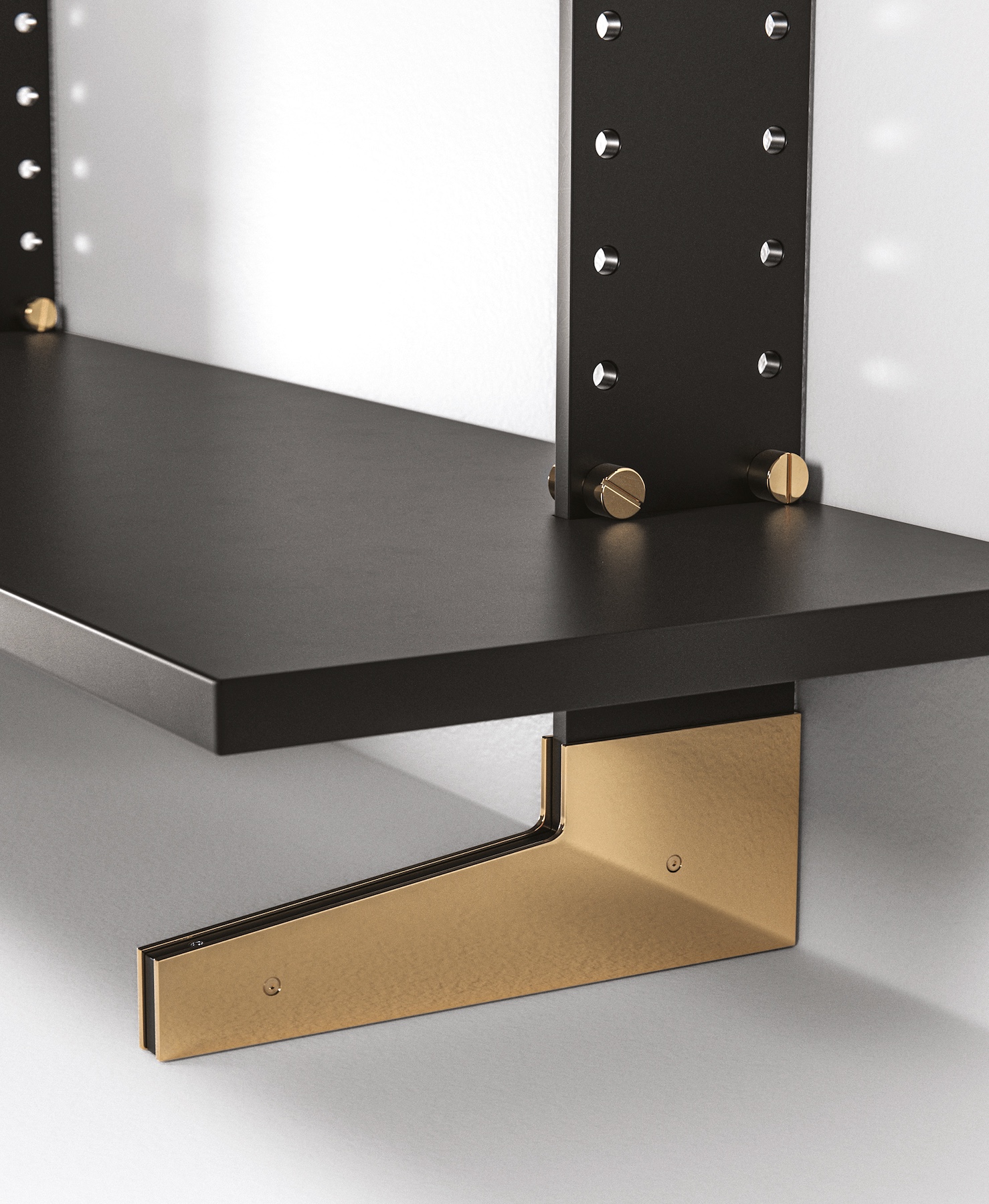 Черный матовый металл направляющих создаёт строгий графичный фон, на котором особенно выделяются детали в отделке Golden Nickel. Контраст холодной глубины лака Nero 14 и теплого оттенка древесины Tabacco 66 наполняет модель ощущением статуса и изысканной сдержанности. Полки и закрытые модули продуманы так, чтобы сочетать удобство хранения и чистоту визуального облика.