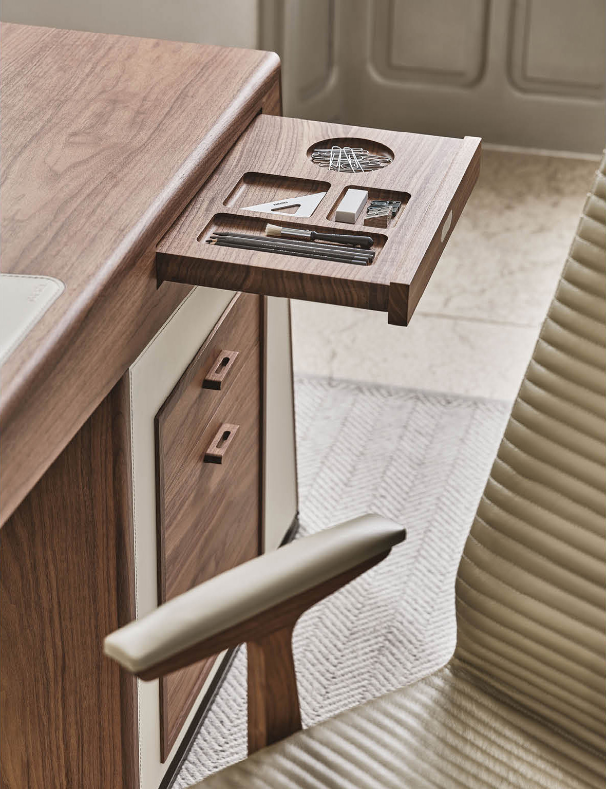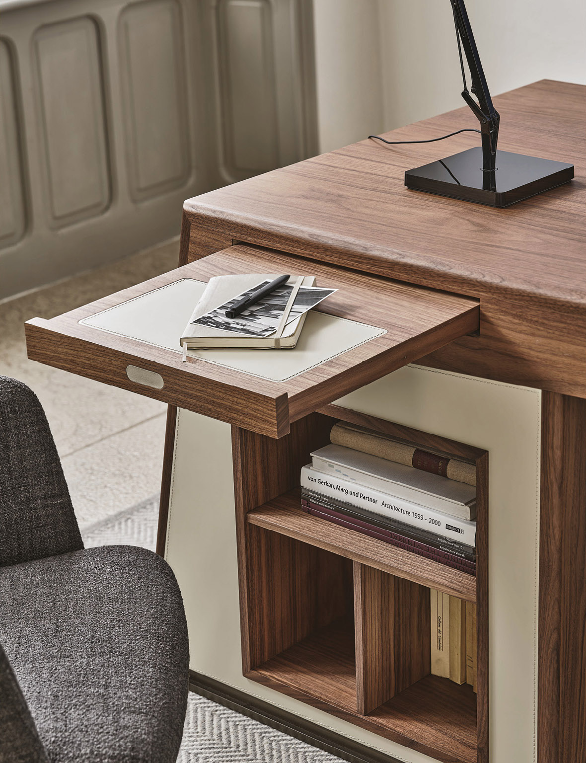 Плотная кожа оттенка темного шоколада покрывает главную рабочую зону и служит практичной подложкой для письма. Теплые металлические акценты мягко подсвечивают глубокую текстуру орехового массива. Правосторонняя система хранения вмещает объемные папки и помогает поддерживать на поверхности идеальный порядок.