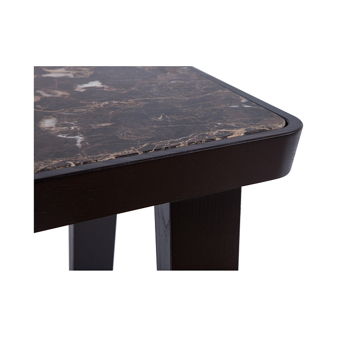Лаконичная форма этого стола только подчеркивает роскошь его отделки. Кофейные прожилки на темном мраморе столешницы создают уникальный природный узор, основание из массива ясеня покрыто отласным лаком цвета венге.