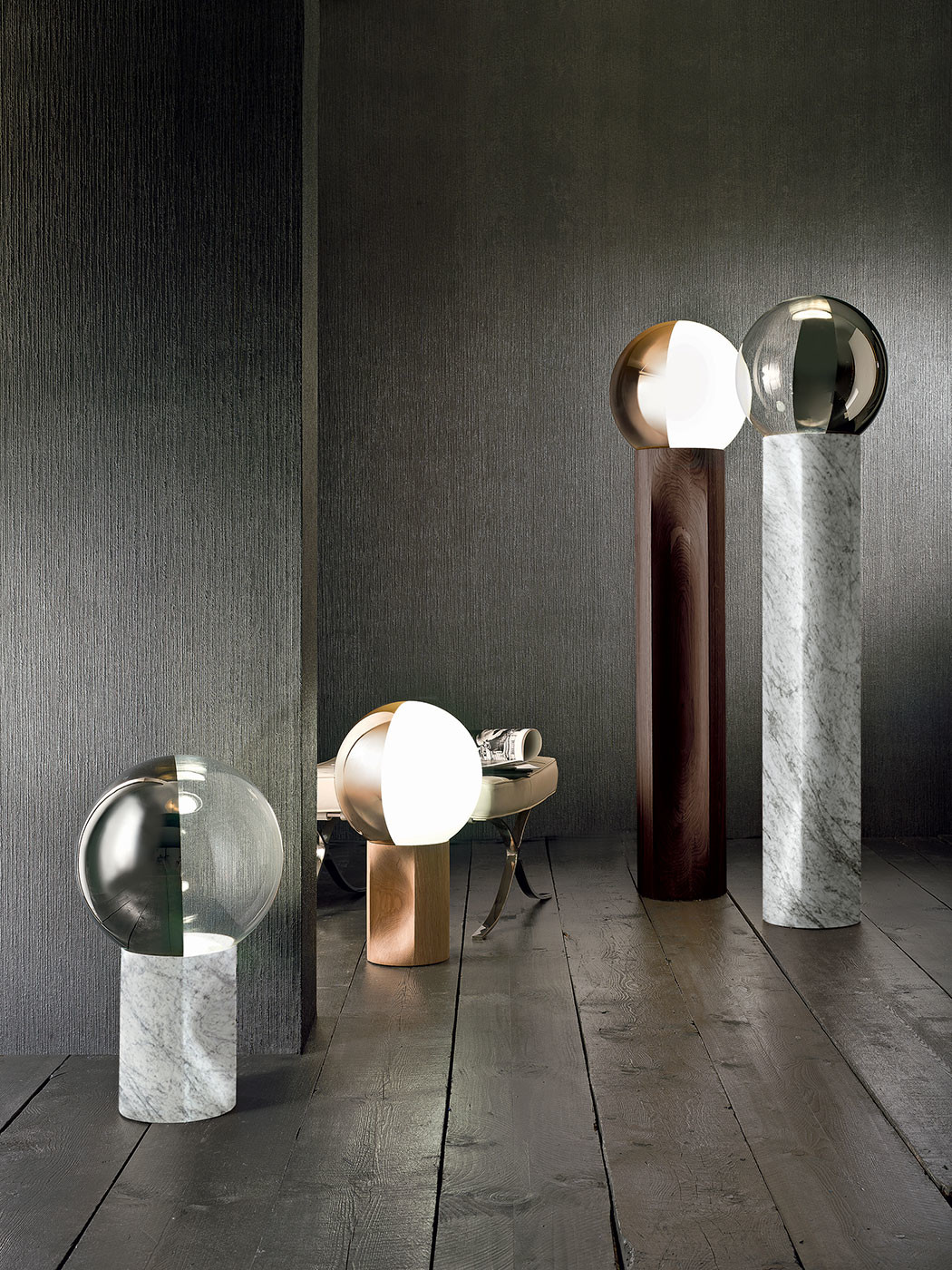 Бело-серебристый рассеиватель из стекла создаёт сложную игру света и отражений, формируя мягкое, атмосферное свечение. Благодаря продуманной конструкции и утончённым пропорциям, Je suis работает не только как источник света, но и как художественный акцент в интерьере.