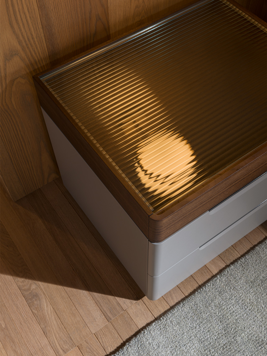 Прикроватная тумба 7070 (2 ящика, 1 лоток) отражает утончённую эстетику Molteni, где лаконичная форма превращается в выразительный предмет спальни. Чистые пропорции создают образ спокойной геометрии, а сочетание разных материалов формирует ощущение продуманной, благородной роскоши.