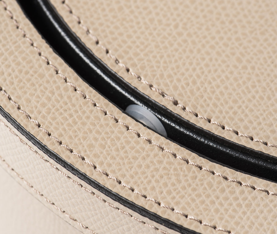 Корпус плотно обтянут гладкой натуральной кожей угольного оттенка. Материал коллекции London отличается прочностью и благородной матовой фактурой. Поворотный механизм крышки срабатывает от легкого нажатия и бесшумно закрывает обзор.