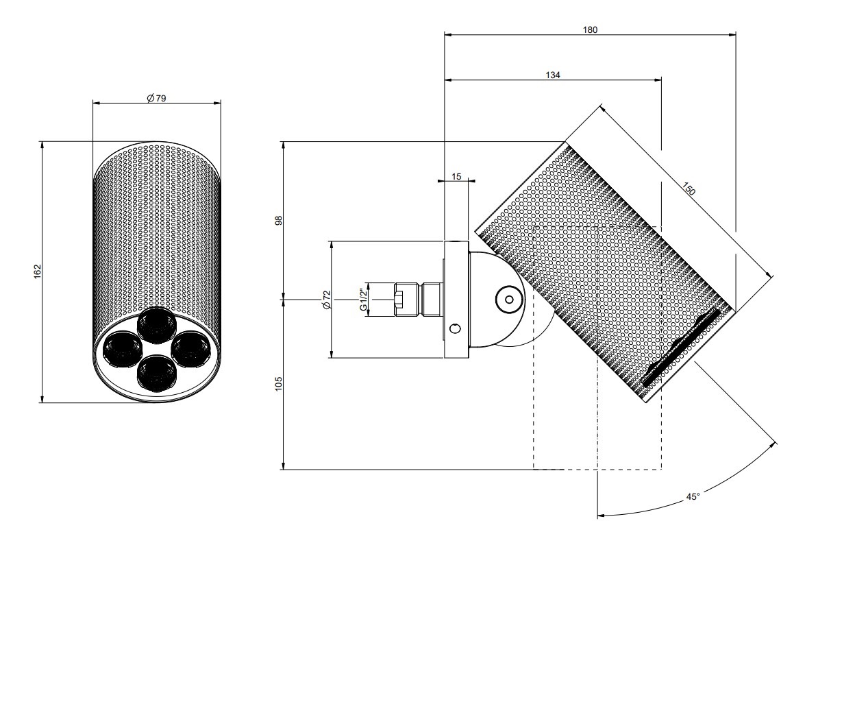 Верхний душ настенный, регулируемый угол наклона.