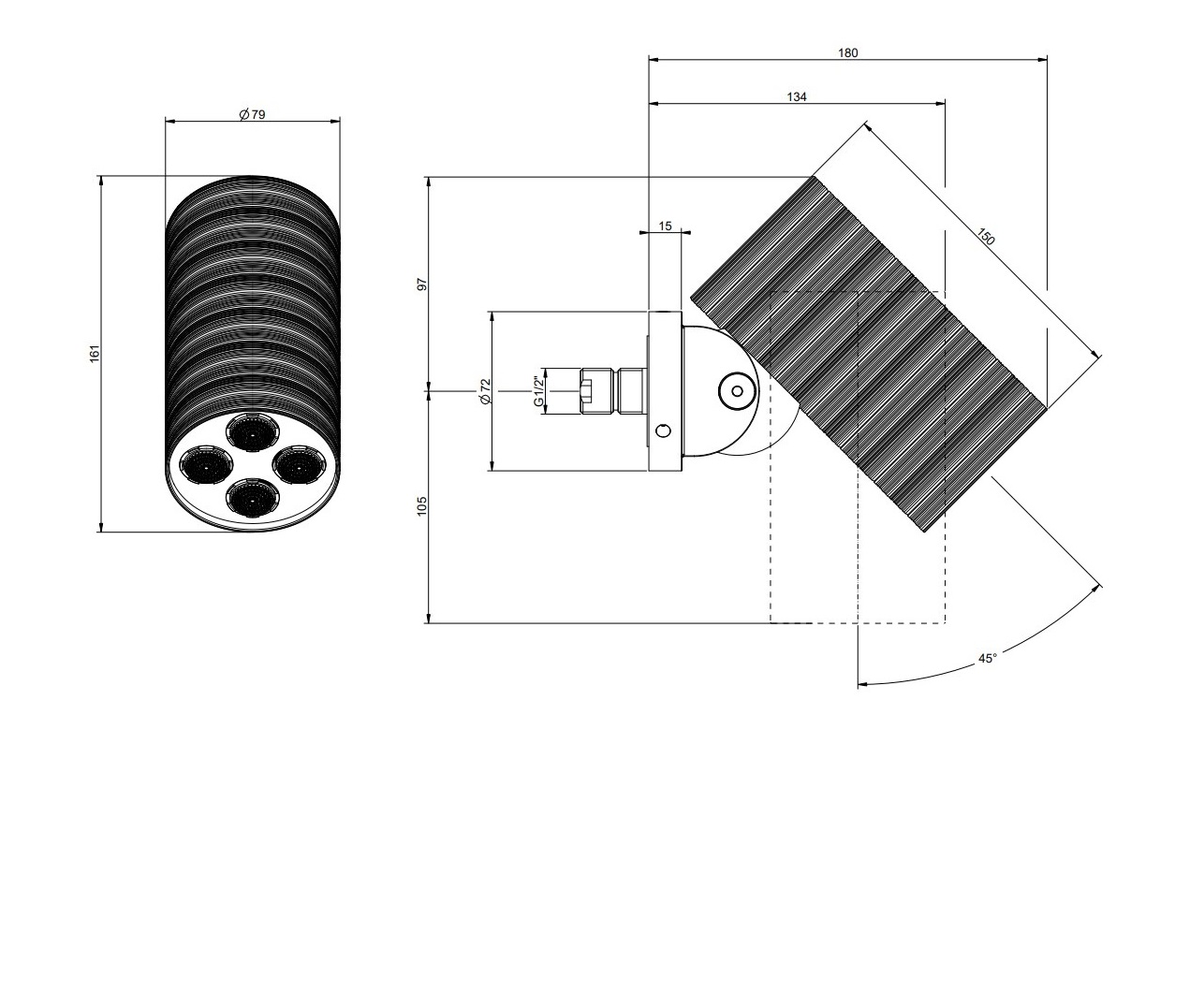 Верхний душ настенный, регулируемый угол наклона.